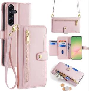 Handykette kompatibel mit Samsung Galaxy A56 | Leder Handyhülle mit Kartenfächern | Handyhülle zum Umhängen | Rosa