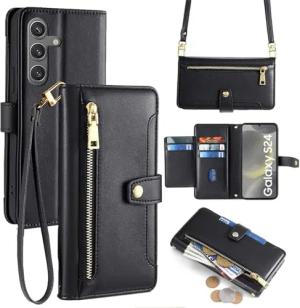 Handykette kompatibel mit Samsung Galaxy S24 | Leder Handyhülle mit Kartenfächern | Handyhülle zum Umhängen | Schwarz