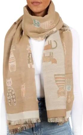 Cashmirillo Damen Schal mit Katzen Muster - 70 x 200 cm - Warm und Kuschelig - Winterschal für Herbst und Winter - Herbstschal - Weiches Kaschmir-Gefühl - Braun und Beige