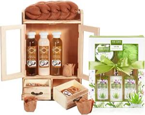 Cosmetics 2 in 1 Pflegeset Kokosnuss & Aloe Vera - Großes 15-teiliges Wellness Set - Damen Dusch- und Badeset - Frauen Beauty Geschenkset mit Deko Holzschrank
