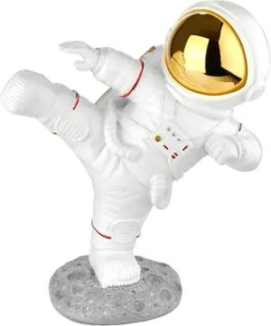 Dekofigur Astronaut in Karate Pose - High Kick - 19 cm Spaceman Weltraum Figur mit verchromtem Helm - Handbemalte Moderne Raumfahrt Statue - Gold und Weiß