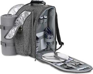 Picknickrucksack für 2 Personen Grau 28 × 40 × 22 cm - mit Kühlfach, Iso-Flaschenhalter und Fleece-Decke mit wasserdichter Unterseite