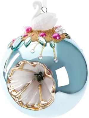 Premium Weihnachtskugel Hellblau mit Schwan Figur - 10 cm Christbaumschmuck mit Perlen Dekorationen - Von Hand dekorierte Baumkugel aus Glas - Weihnachtsdeko Christbaumkugel