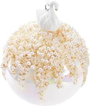 Premium Weihnachtskugel Perle mit Schwan Porzellan Figur - 10 cm Baumkugel aus Glas - Hergestellt in Handarbeit - Christbaumschmuck Weihnachtsdeko Christbaumkugel - Weiß Bunt