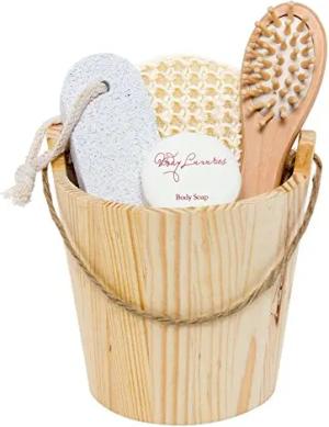 Wellness Set im Holzkübel - 5-teiliges Geschenkset mit Peelingschwamm, Haarbürste, Bimsstein, Seife und Holzeimer