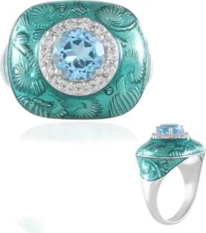 Schweizblauer Topas Ring 0,72 ct mit Zirkonen 0,252 ct, modernes 925 Sterling Silber platinierter Adela Silberring, rund geschliffen, lebhafte türkisfarbene Eleganz