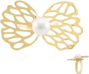 Weißer Süßwasserzuchtperlen Ring Damen, vergoldeter 925er Silberring mit rundem 8 mm Perlenstein, eleganter Schmetterling Silberring Schmuck für besondere Anlässe