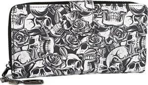 Damen Geldbörse mit Allover Totenkopf Rosen Print, Reißverschluss und Druckknopf, Portemonnaie 02040151, Farbe:Schwarz-Weiß