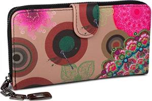 Damen Geldbörse mit Buntem Blumen Blüten Mandala Muster, Ethno Style, Reißverschluss, Portemonnaie 02040040, Farbe:Beige-Braun-Dunkelbraun-Pink