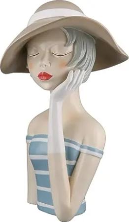 Deko Skulptur Figur Lady - mit Hut rote Lippen - Dekoration Badezimmer Wohnzimmr - Höhe 32 cm - blau weiß Creme