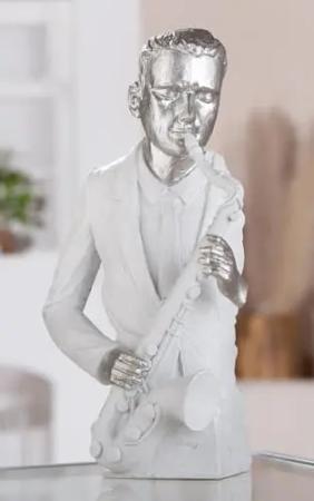 Figur Musician, Kunstharz, weiß, matt, metallische Optik, Saxophon, Musiker, H: 31,5 cm, B: 19,5 cm, T: 11,5 cm - Dekoration, Geschenk, Kunst, Skulptur
