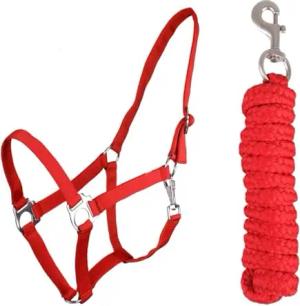 Halfter-Set Beginner - Halfter + Führstrick mit Karabinerhaken verstellbar (Pony, Rot)