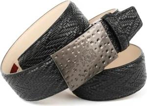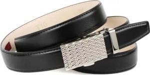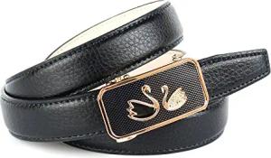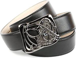 Damen Automatikgürtel – 3D-Design in Schwarz, 3,5 cm breit, schwarze Metallic-Schnalle mit rotem Raster & Logo, hochwertiges Leder, exklusives Fashion-Accessoire (100)