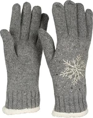 Damen Handschuhe mit gestickter Schneeflocke, Strass und Fleece, warme Thermo Winter Strickhandschuhe 09010020, Farbe:Grau