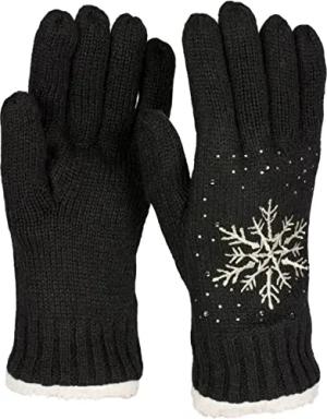 Damen Handschuhe mit gestickter Schneeflocke, Strass und Fleece, warme Thermo Winter Strickhandschuhe 09010020, Farbe:Schwarz