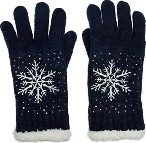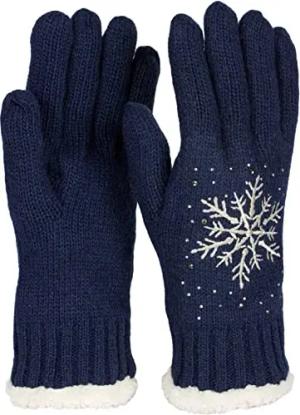 Damen Handschuhe mit gestickter Schneeflocke, Strass und Fleece, warme Thermo Winter Strickhandschuhe 09010020, Farbe:Dunkelblau
