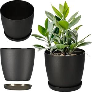 Blumentopf, Pflanzkübel-Set mit Untersetzer, Blumenkübel aus Kunststoff, runder Pflanztopf für Innenbereich, Übertopf für Blumen und Zimmerpflanzen, Kräutertopf (Set of 3 – 23cm, schwarz)