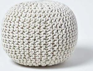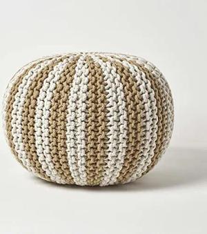 Pouf Strickpouf rundes Bodenkissen, Sitzpouf 35 x 40 cm, gepolsterter Sitzhocker, Sitzpuff/Puff mit grob gestricktem Bezug aus 100% Baumwolle, Strickpuff, Natur/naturweiß