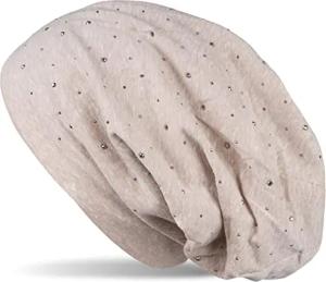Damen Beanie Mütze mit edler Strass-Nieten Applikation, Longbeanie Slouch 04024037, Braun meliert/Used Look