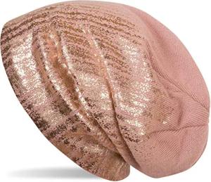 warme Feinstrick Beanie Mütze mit Metallic Print und Fleece Innenfutter, Slouch Longbeanie, Unisex 04024132, Farbe:Altrose/Rosegold