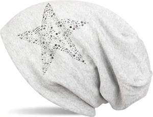 Damen Slouch Beanie Mütze mit Strass Stern | Glitzer Longbeanie aus weicher Viskose | One Size für Erwachsene, Farbe:Hellgrau meliert