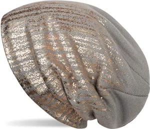 warme Feinstrick Beanie Mütze mit Metallic Print und Fleece Innenfutter, Slouch Longbeanie, Unisex 04024132, Farbe:Beige/Silber