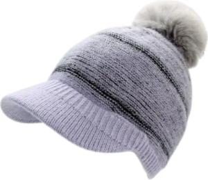 Warme Damen Strickmütze mit festem Schirm, gefüttert und zweifarbig - Winter Schirmmütze mit Bommel - A500 (DE/NL/SE/PL, Alphanumerisch, Einheitsgröße, A500-LavendelSchwarz)