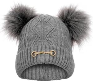 Damen Winter-Mütze Strick Fleecefutter Kunstfell-Bommel Pudelmütze Wintermode Outdoor Hellgrau Unisize