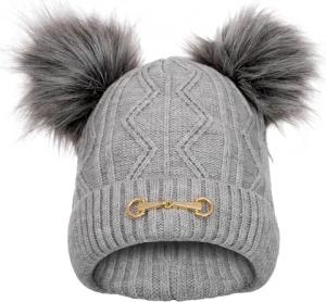 MU054 Damen Winter Strickmütze mit großem Fellbommel, Farbe:grau