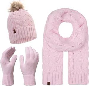 Winter Mütze mit Bommel Schal Set Geschenkset Wintermütze Winterschal Winterhandschuhe Herrenmütze Damenmütze U-101 Rosa Einheitsgröße