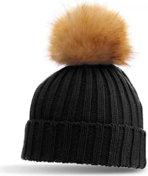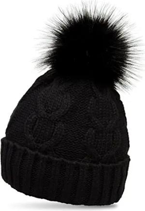 MU054 Damen Winter Strickmütze mit großem Fellbommel, Farbe:schwarz
