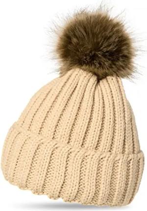 MU054 Damen Winter Strickmütze mit großem Fellbommel, Farbe:aprikot
