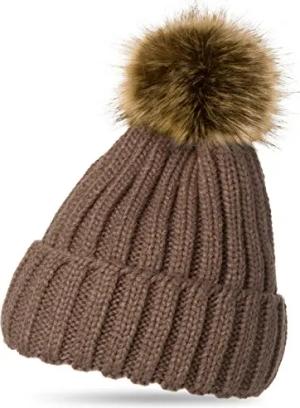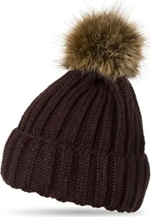 MU054 Damen Winter Strickmütze mit großem Fellbommel, Farbe:Dunkelbraun