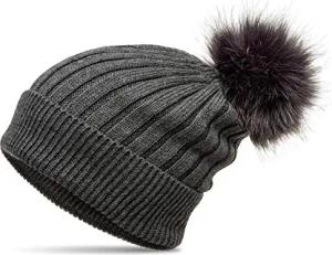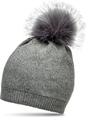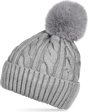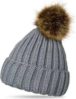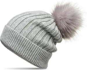 MU054 Damen Winter Strickmütze mit großem Fellbommel, Farbe:grau