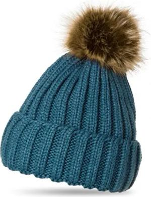 MU054 Damen Winter Strickmütze mit großem Fellbommel, Farbe:Jeans blau
