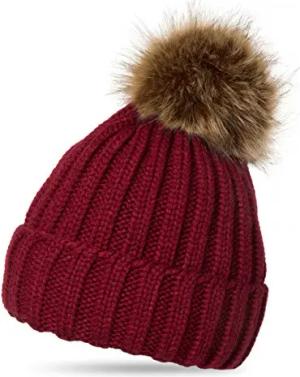 MU054 Damen Winter Strickmütze mit großem Fellbommel, Farbe:weinrot