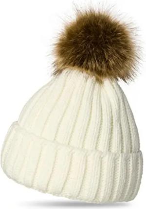 MU054 Damen Winter Strickmütze mit großem Fellbommel, Farbe:Weiss