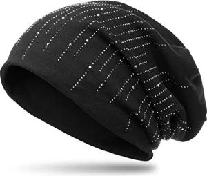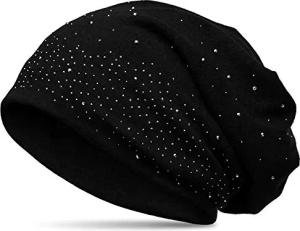 MU137 Beanie Mütze mit Strass und warmem Flanell Stoff, Größe:One Size, Farbe:schwarz (uni)