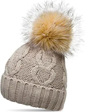 MU163 Damen Mütze Strickmütze mit tierschutzgerechtem Kunstfell Bommel und klassischem Zopf Strickmuster, Farbe:beige, Größe:One Size