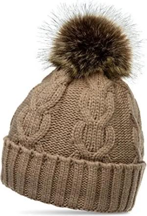 Damen klassische Winter Mütze/Strickmütze mit großem Fellbommel - viele Farben, Farbe:cognac
