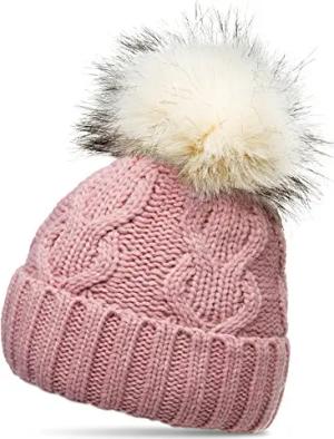 MU163 Damen Mütze Strickmütze mit tierschutzgerechtem Kunstfell Bommel und klassischem Zopf Strickmuster, Größe:One Size, Farbe:rosa