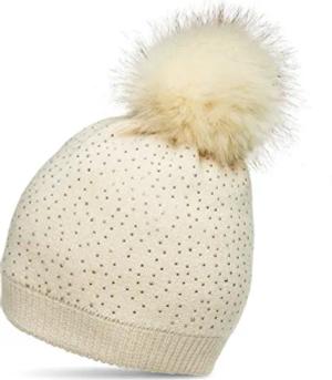MU191 Damen Fein Strick Winter Mütze mit Fellbommel und dezentem Glitzer Strass, Farbe:beige, Größe:One Size