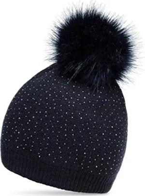 MU191 Damen Fein Strick Winter Mütze mit Fellbommel und dezentem Glitzer Strass, Farbe:dunkelblau, Größe:One Size