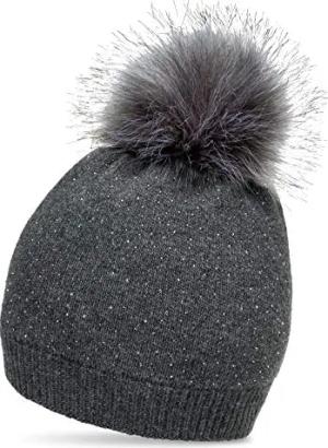 MU191 Damen Fein Strick Winter Mütze mit Fellbommel und dezentem Glitzer Strass, Farbe:dunkelgrau, Größe:One Size