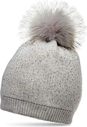 MU191 Damen Fein Strick Winter Mütze mit Fellbommel und dezentem Glitzer Strass, Farbe:hell grau, Größe:One Size
