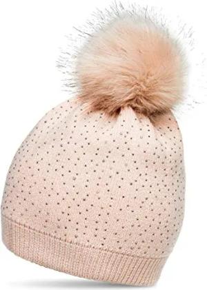 MU191 Damen Fein Strick Winter Mütze mit Fellbommel und dezentem Glitzer Strass, Größe:One Size, Farbe:rosa