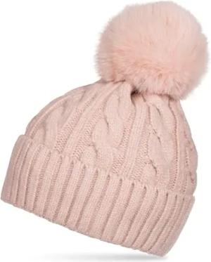 MU218 Warme Damen Bommelmütze mit Teddy-Fleece und Zopfmuster, Farbe:rosa, Hutgröße:One Size