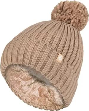 Damen Warm Strick Kunstfell Mütze mit Bommel und Fleecefutter (One Size, Beige (Arden))