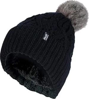 Damen Winter Warm Strick Beanie/Mütze mit Bommel und Fleecefutter (One Size, Black (Lund))