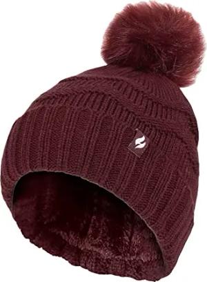 Damen Elegant Strickmütze Gefüttert Groß Beanie mit Bommel und Fleecefutter (Einheitsgröße, Wein)